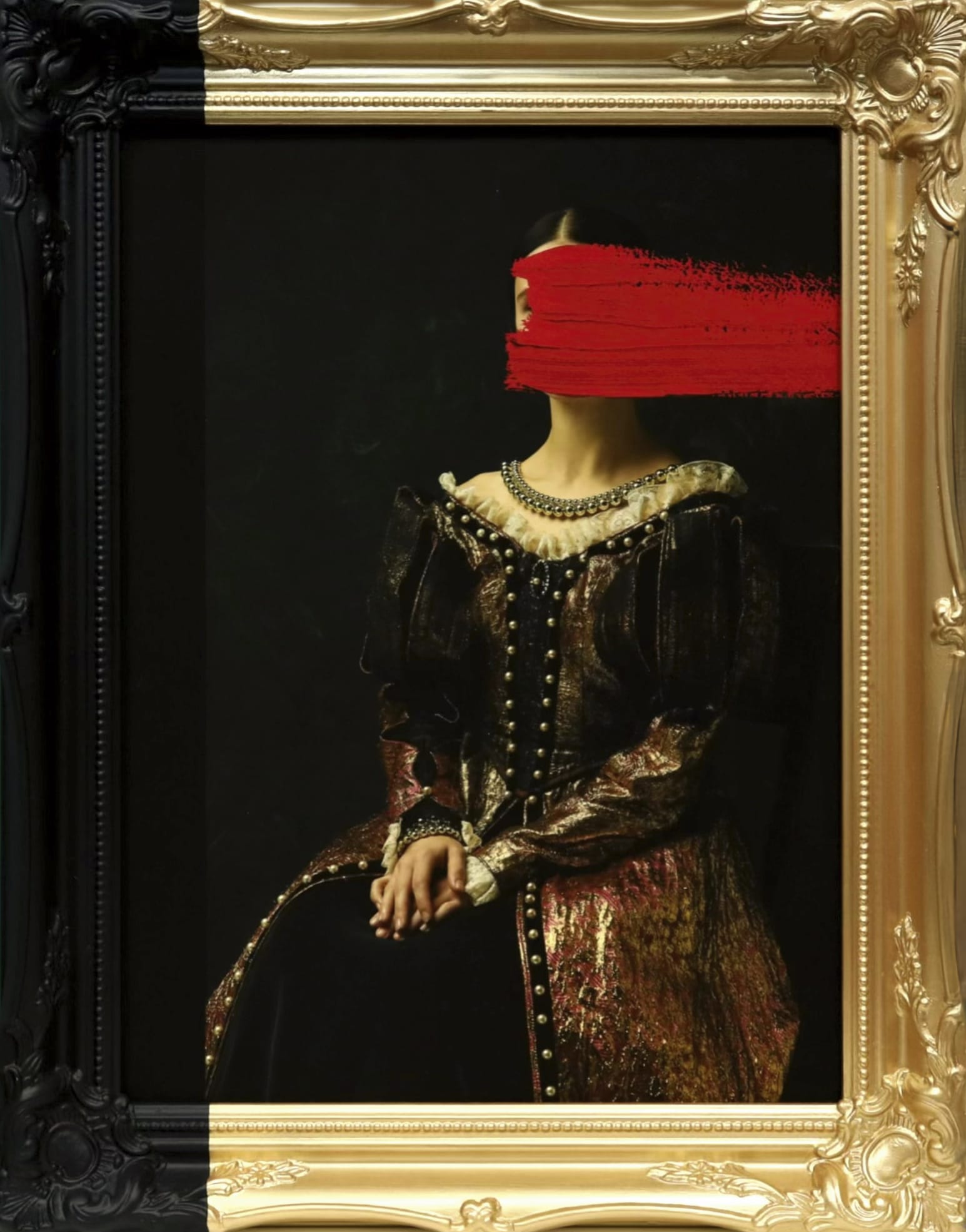 A provocative contemporary remix of Dutch Golden Age portraiture, featuring ornate period costume with a bold red brushstroke obscuring the subject’s face. The juxtaposition of classical technique and modern intervention questions identity, visibility, and artistic tradition. Museum-quality conversation piece for sophisticated collectors of conceptual art.