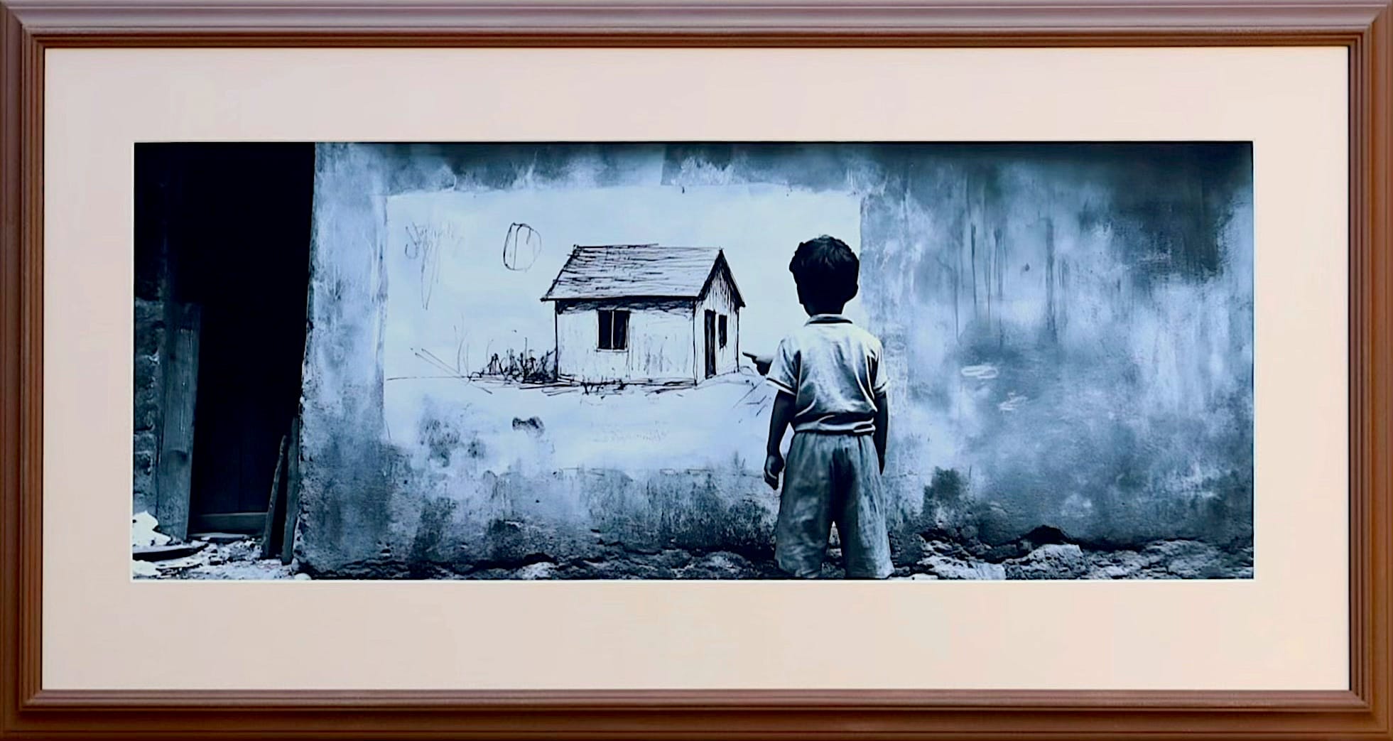A deeply moving street art photograph capturing a young boy gazing at a hand-drawn house sketch on a weathered blue wall, embodying childhood hope against urban hardship. The poignant composition and cool blue tones create powerful emotional resonance exploring themes of aspiration, innocence, and the universal longing for home. Socially conscious fine art photography for collectors who value narrative depth and humanitarian perspectives.