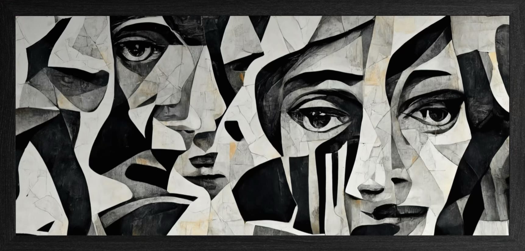 A stunning cubist composition featuring fragmented human faces in monochromatic tones with geometric precision. Bold black lines intersect cream and gray planes, creating a powerful dialogue between form and emotion. Perfect for contemporary spaces seeking intellectual depth and artistic conversation.