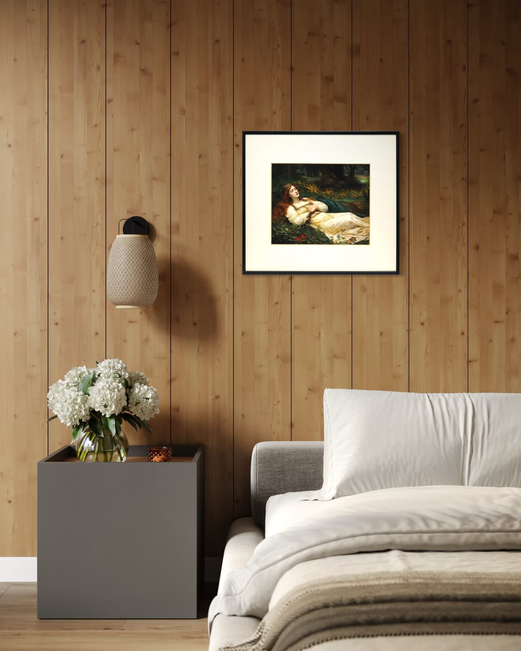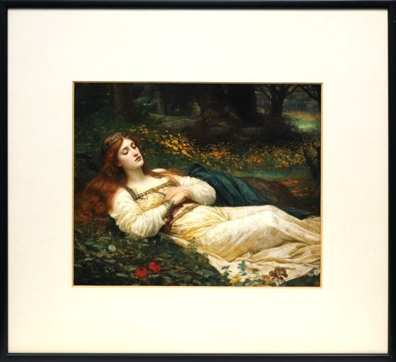 A romantic classical painting depicting a red-haired maiden in ornate medieval dress reclining among wildflowers in an enchanted forest. The Pre-Raphaelite influence shines through luminous skin tones and exquisite detail. Timeless elegance for traditional or eclectic interiors.