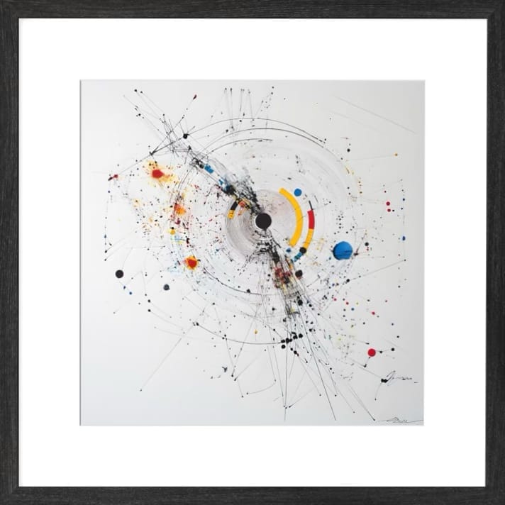 A mesmerizing scientific abstract featuring delicate line work, orbital trajectories, and colorful particle bursts against pristine white. The composition evokes particle physics, celestial mechanics, and the hidden mathematics of the universe. Intellectual elegance for modern spaces celebrating science, curiosity, and minimalist beauty.