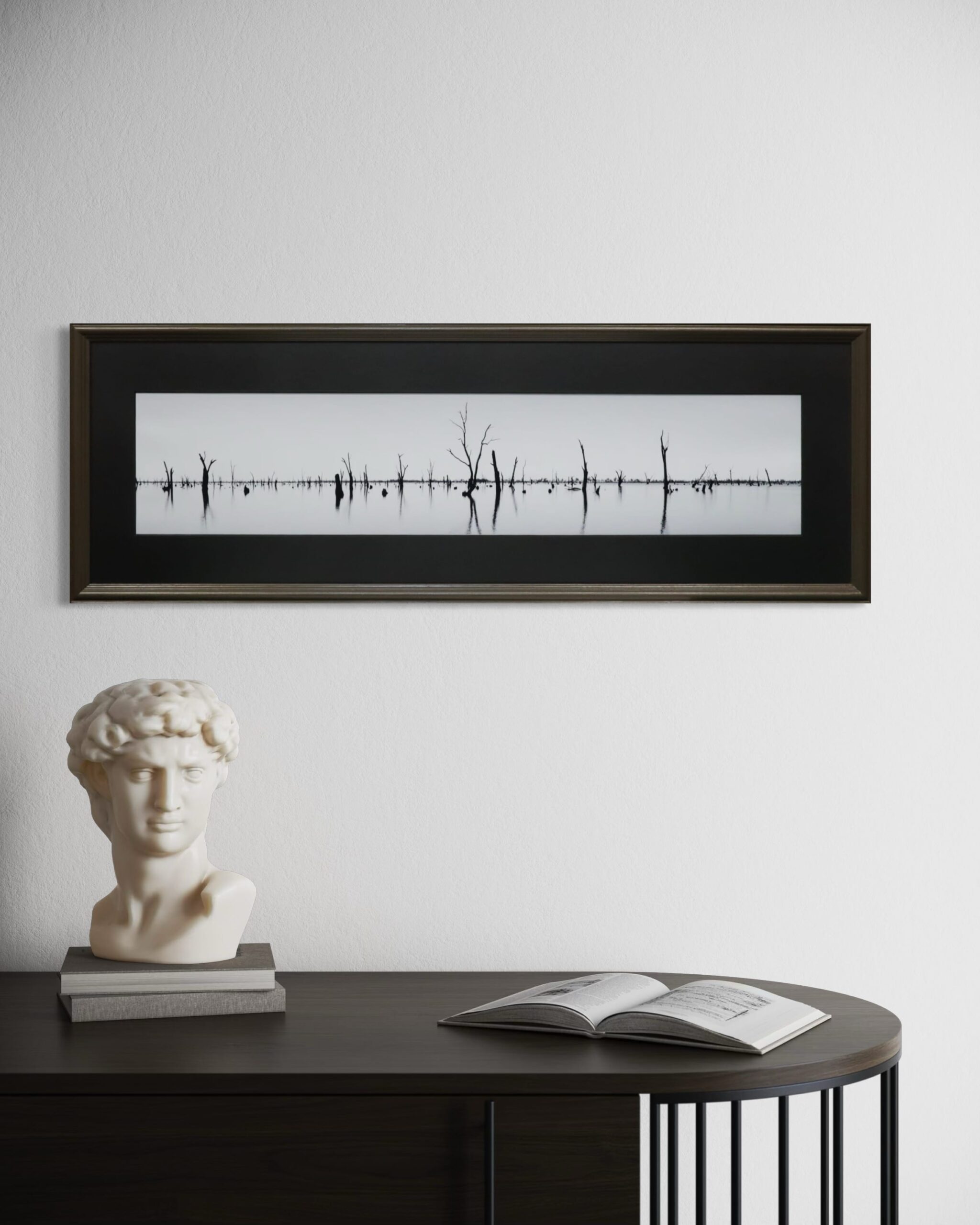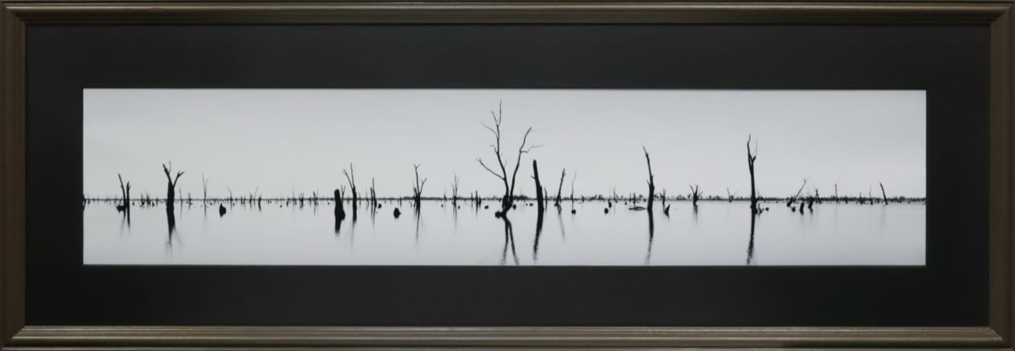 A hauntingly beautiful black and white panoramic photograph of skeletal trees standing in mirror-still floodwaters, their perfect reflections doubling the stark composition. The minimalist palette and horizontal expanse evoke profound stillness, environmental meditation, and the sublime beauty of nature’s cycles. Museum-quality fine art photography for collectors seeking tranquil, contemplative pieces with dramatic visual impact.