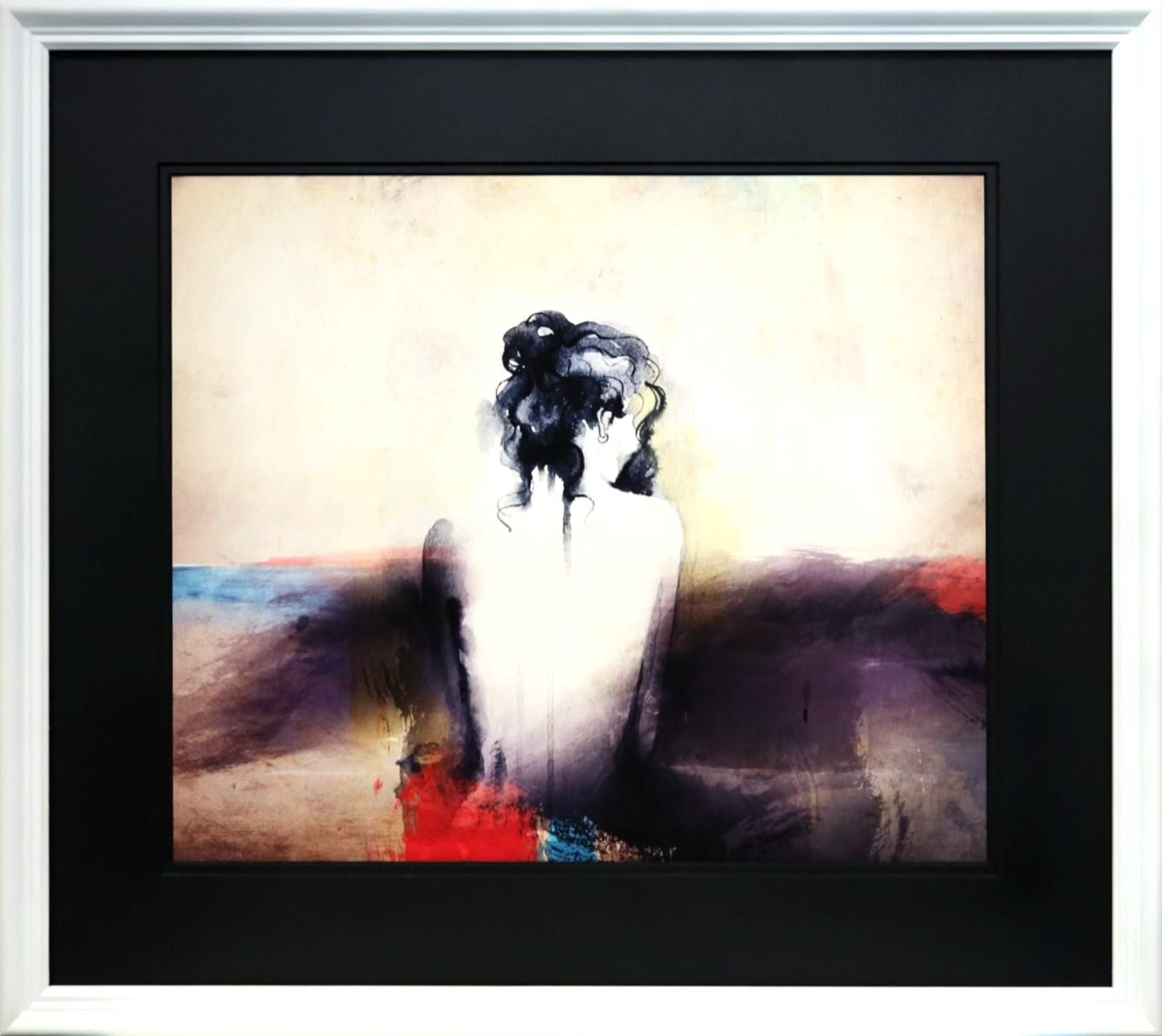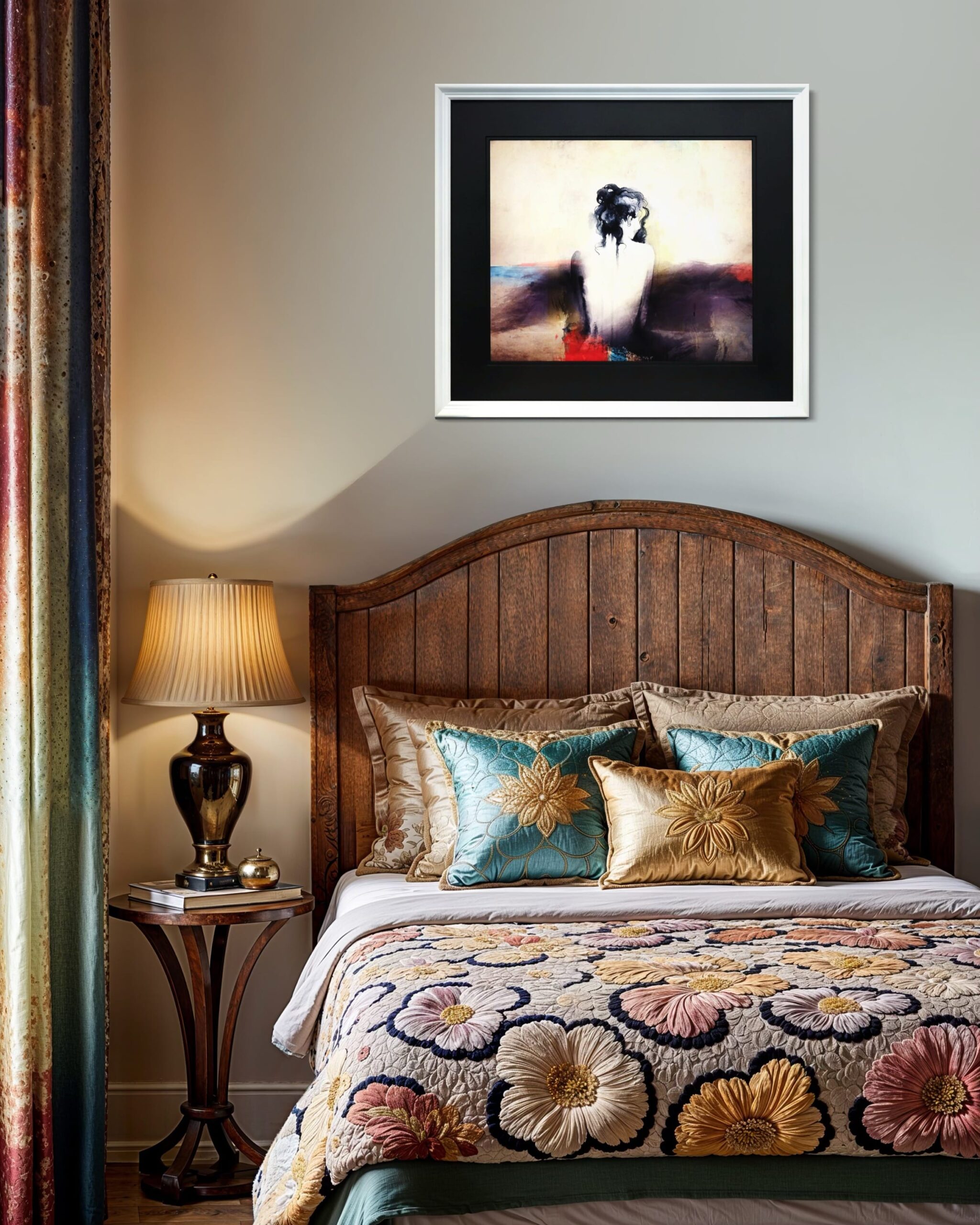 An evocative figure study of a woman seen from behind, her dark silhouette emerging from a dreamlike wash of purple, blue, and crimson. The atmospheric quality suggests introspection, mystery, and quiet strength. Perfect for creating intimate, contemplative spaces.