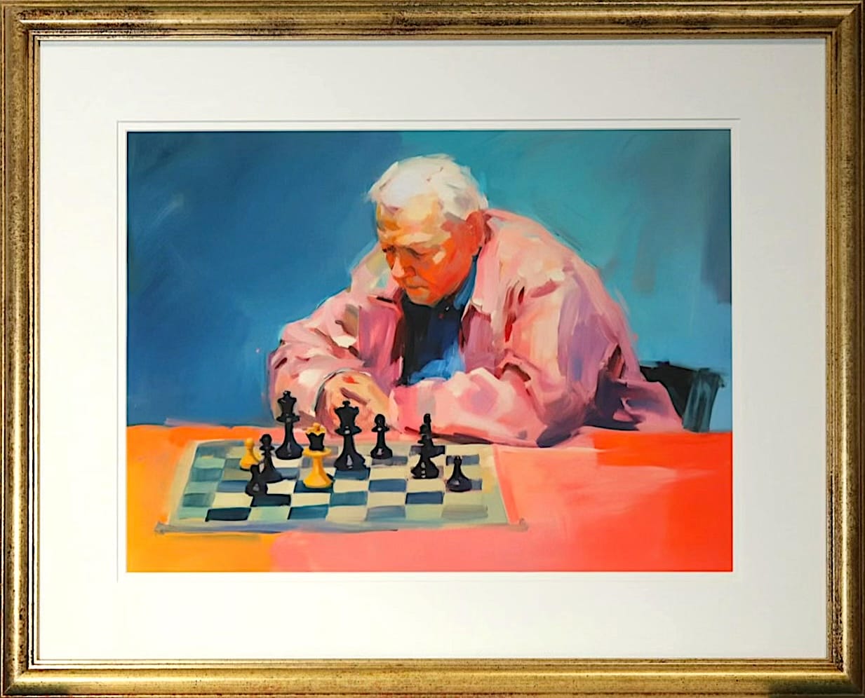 An intimate portrait capturing a silver-haired chess player in quiet contemplation, rendered in vibrant blues and warm pinks. The bold color palette and expressive brushwork create a tender moment frozen in time. Ideal for collectors who appreciate the intersection of strategy, wisdom, and artistic vulnerability.