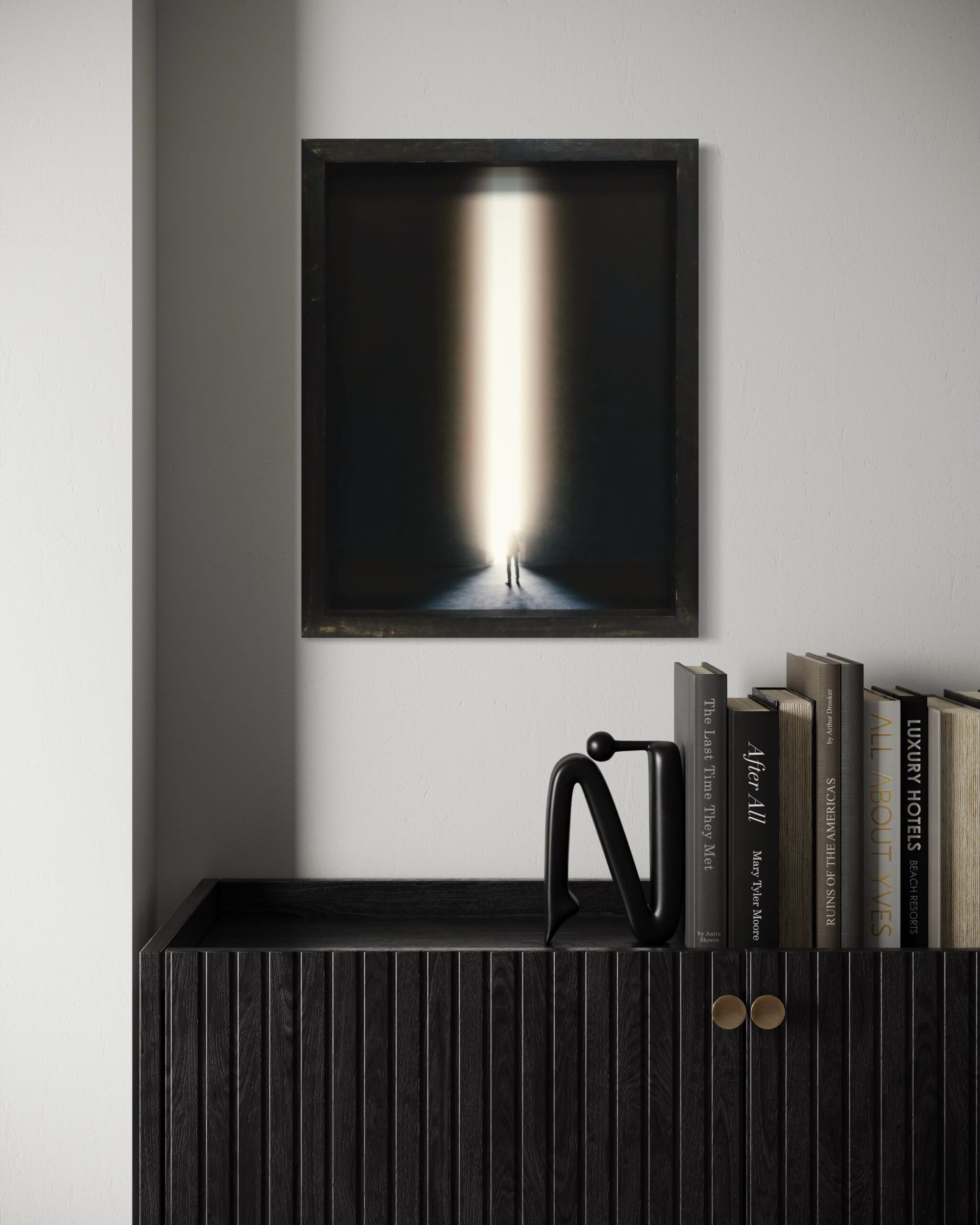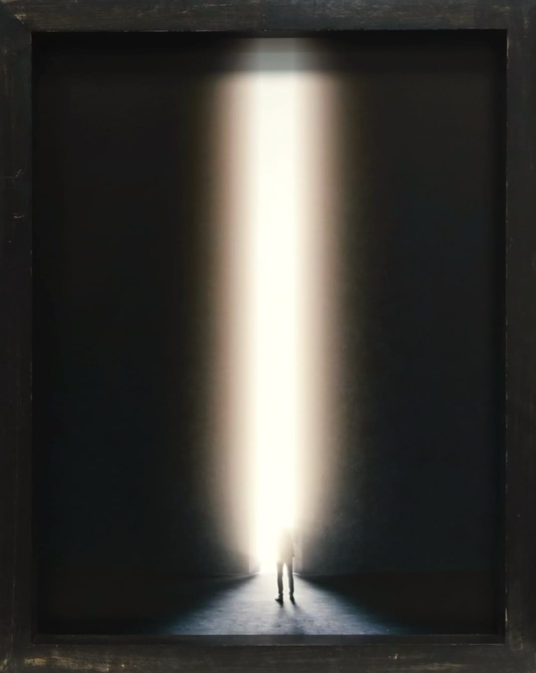 A profound minimalist photograph showing a solitary figure before an immense column of radiant light piercing absolute darkness. The dramatic contrast evokes themes of spirituality, hope, and transformation. Statement art for those drawn to philosophical and contemplative visual narratives.