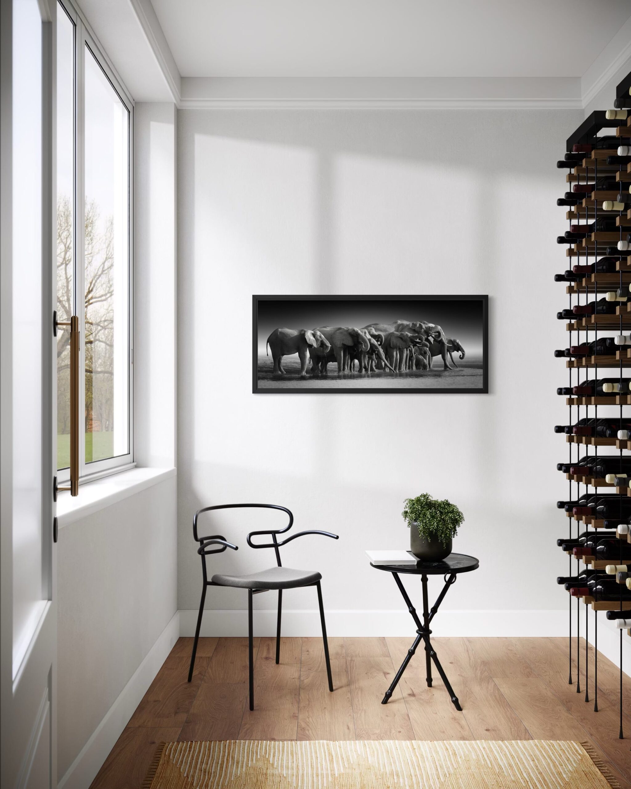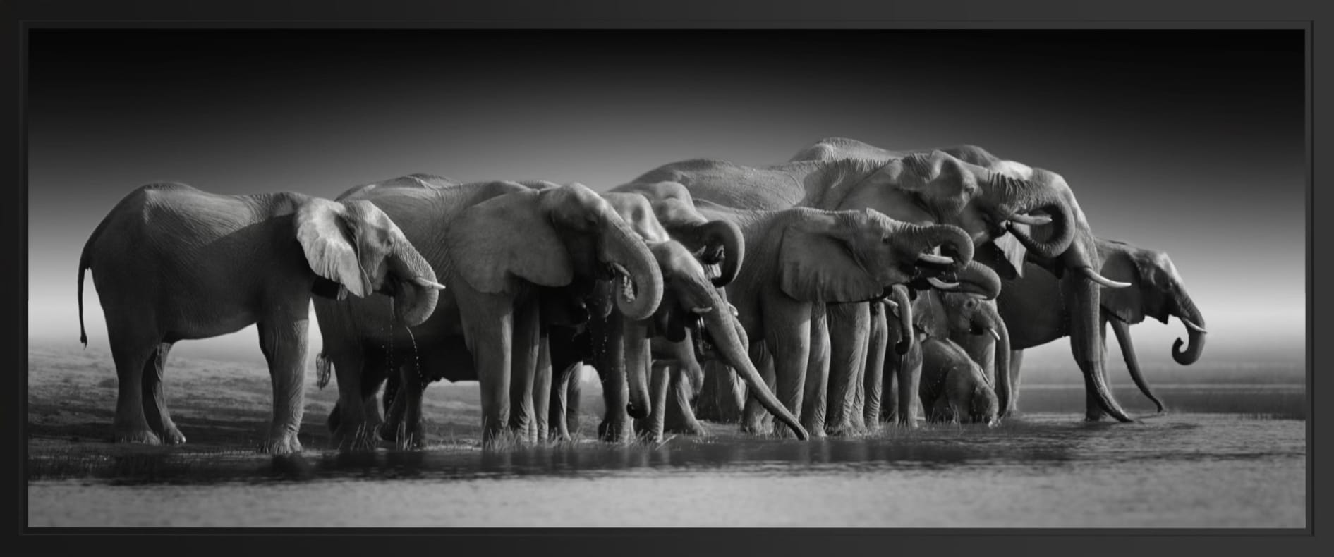 A breathtaking black and white panoramic photograph of an elephant family clustering together in African wilderness. The dramatic composition and stunning detail celebrate community, protection, and the majesty of wildlife. Perfect for nature lovers and those drawn to conservation themes.