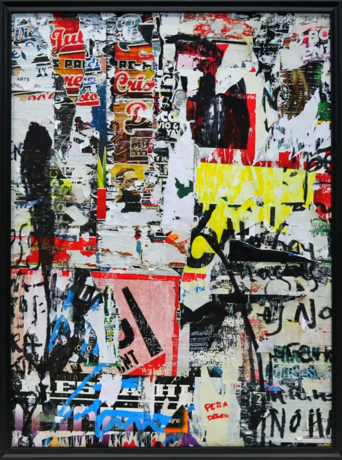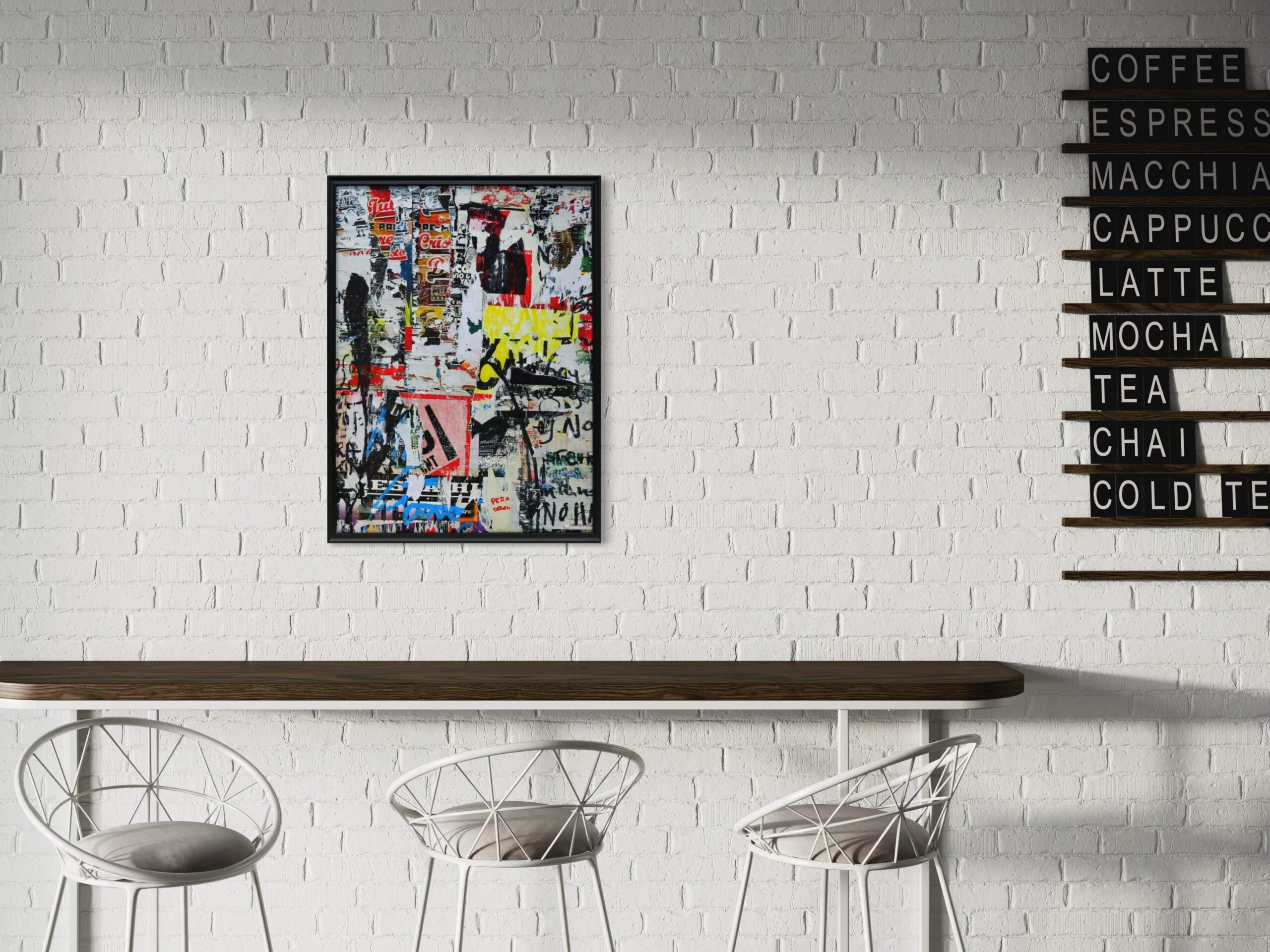 An electrifying street art collage bursting with torn posters, spray-painted text, and layered graphic elements in red, yellow, and electric blue. The raw energy and authentic urban aesthetic capture the pulse of contemporary city life. Statement art for edgy, modern spaces embracing pop culture and street culture fusion.
