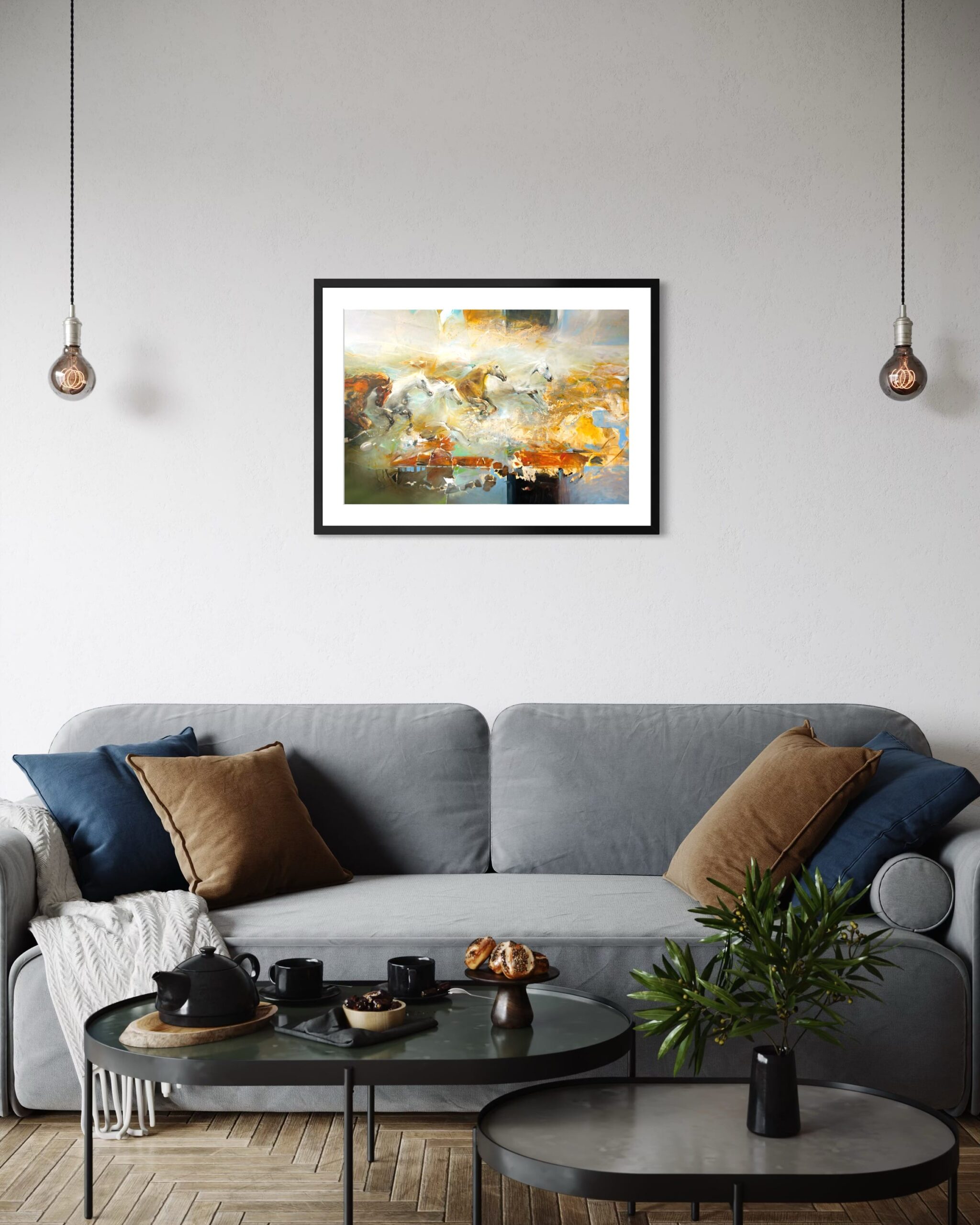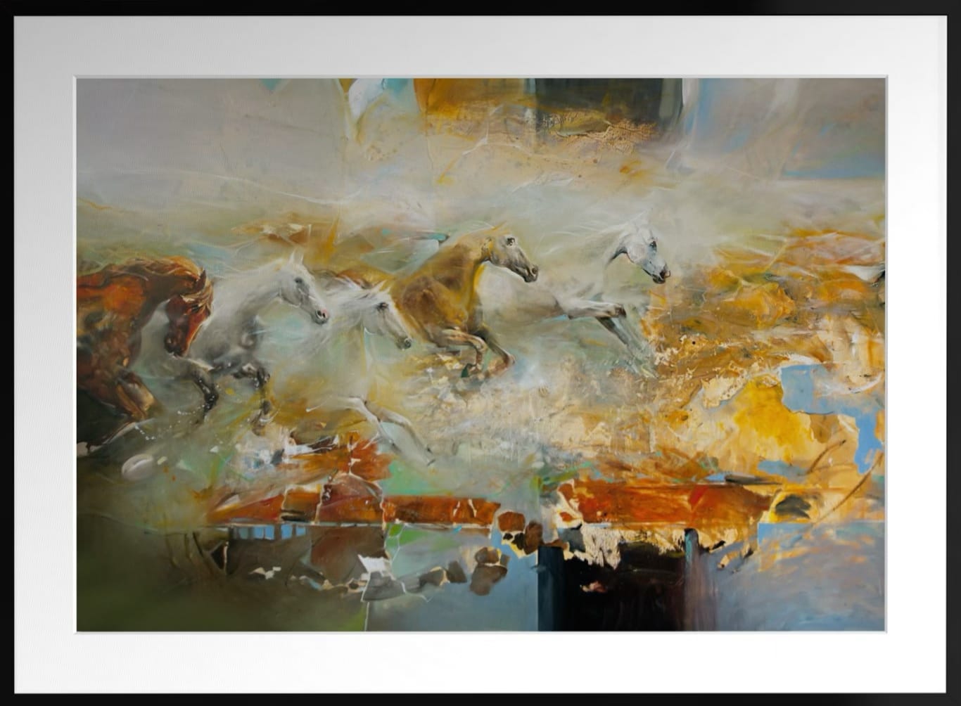 A breathtaking abstract expressionist masterpiece depicting galloping horses dissolving into swirling clouds of gold, cream, and turquoise. The dynamic brushwork and ethereal quality capture untamed freedom and poetic movement across dreamlike plains. Spectacular focal point art for collectors seeking emotion, energy, and sophisticated color harmony.